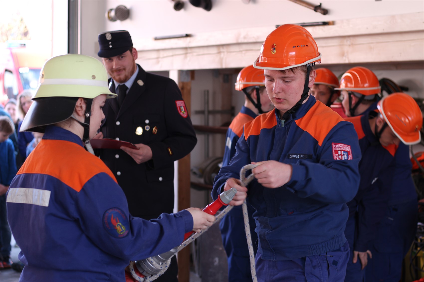 Neben den sieben Jugendlichen zur Jugendleistungsspange, durften sich fünf Jugendfeuerwehrler und -feuerwehrlerinnen beim Abzeichen „Jugendflamme Stufe 1“ beweisen. Hier ging es darum, die Handhabung und Funktionen der grundlegendsten feuerwehrtechnischen Geräte zu erläutern. Ebenso gehören die Knoten, Stiche und einen Notruf korrekt absetzen zum Prüfungsumfang.